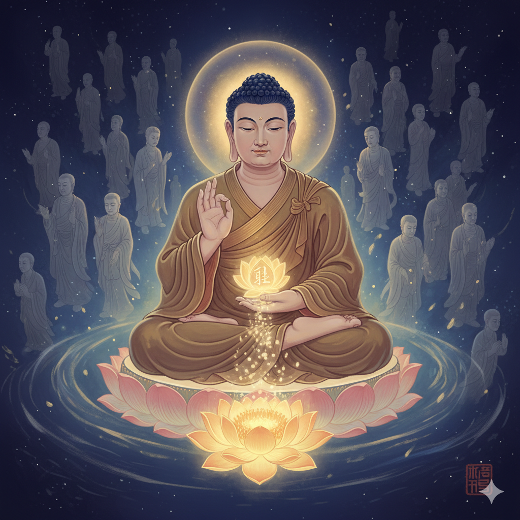 - 이미지 생성 프롬프트 (Google Nano Banana 스타일): Korean: 고요한 우주 공간에 부처님이 단정하고 위엄 있는 모습으로 앉아 설법하고 있다. 부처님 주변으로는 다양한 크기와 형태로 표현된 '아(我)'의 환영들이 떠다니다가, 모두 사라지며 부처님의 손에서 피어나는 황금빛 연꽃(불성) 속으로 녹아든다. 연꽃은 잔잔한 빛을 발하며 모든 허상을 초월한 진정한 자아의 존재를 상징. 영적이고 신비로운 동양화풍. 모든 인물은 단정하게 옷을 입고 있다. English: In a serene cosmic space, the Buddha sits delivering a discourse with a neat, dignified appearance. Around him, illusory 'selves' of various sizes and forms float, then vanish, dissolving into a golden lotus (Buddha-nature) blossoming from his hand. The lotus emits a gentle light, symbolizing the true self that transcends all illusions. A spiritual and mystical Eastern painting style. All figures are neatly dressed.