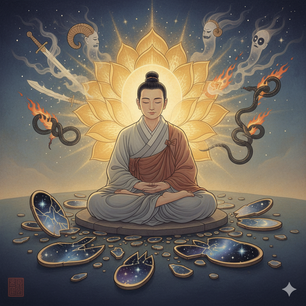 🖼️ 시의 강조 메시지 이미지 생성 프롬프트 (Google Nano Banana 스타일): Korean: 고요하고 신비로운 동양화풍의 우주 공간. 중앙에는 단정한 옷을 입은 인물이 눈을 감고 평온하게 좌선하고 있다. 인물의 등 뒤로는 마치 만다라처럼 빛나는 황금빛 연꽃이 크게 피어나 있으며, 그 연꽃의 빛이 모든 혼란스러운 상상(칼, 뿔, 불꽃, 뱀 등)을 사라지게 한다. 화면 아래쪽에는 '아상'을 상징하는 깨진 거울 조각들이 흩어져 있고, 그 조각들 너머로 무한한 평화와 지혜를 상징하는 우주의 별들이 반짝인다. 시적인 여운과 깊은 깨달음의 순간을 묘사한다. English: In a serene, mystical East Asian painting-style cosmic space, a neatly dressed figure sits peacefully in meditation with closed eyes. Behind the figure, a grand, mandala-like golden lotus blooms, its light dissolving all chaotic illusions (swords, horns, flames, snakes, etc.). At the bottom of the screen, broken mirror fragments symbolizing 'A-sang' are scattered, and beyond them, countless stars of the universe twinkle, signifying infinite peace and wisdom. Depicts a poetic lingering impression and a moment of profound enlightenment.