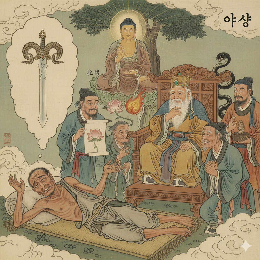 - 집착은 고통의 시작: 보지도 못하고 만져보지도 못한 칼에 대한 맹목적인 갈망이 한 남자의 삶을 흔들었듯, 실체가 없는 대상에 대한 집착은 결국 우리를 번뇌와 고통으로 이끌게 됩니다. 돈, 명예, 사랑, 심지어 '내가 옳다'는 생각까지도 지나친 집착은 마음의 평화를 깨뜨린다는 교훈을 줍니다.