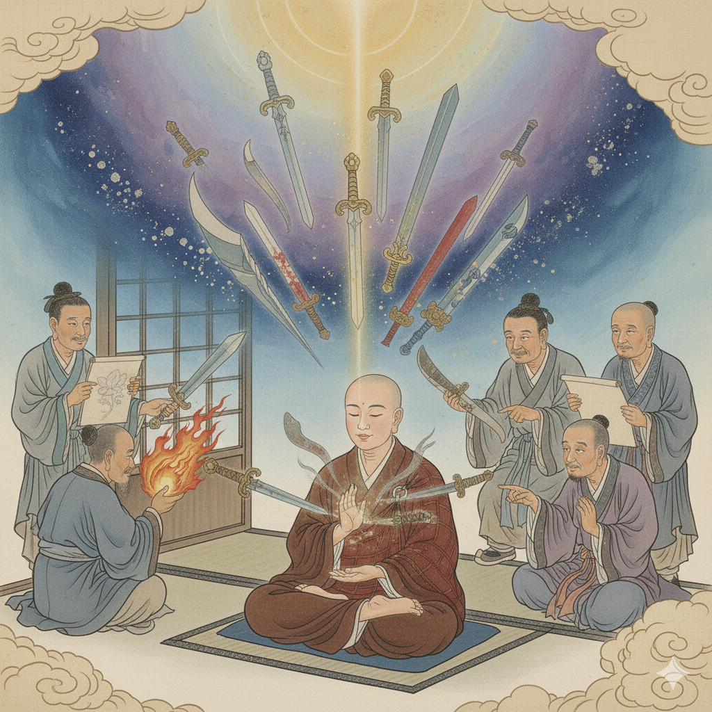 - Japanese: 「正明刀」は、物語に登場する架空の剣の名前で、人々がその実体を知らないまま、それぞれ異なる姿を想像し主張する「幻想の対象」を象徴します。これは、私たちが真の自己を見ずに勝手に想像して作り出す「我相」の虚構性を比喩する重要な装置です。
