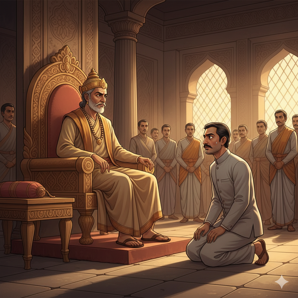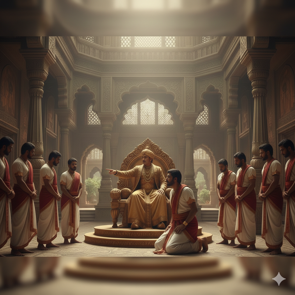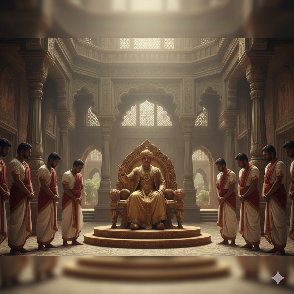 - [한글] 왕궁의 넓은 홀, 아쇼카왕이 왕좌에 앉아 굳건한 표정으로 신하들에게 엄중히 명령을 내리고 있다. 신하들은 단정한 복장을 한 채 고개를 숙이며 경청하고 있으며, 그들의 눈빛에는 다소 의아한 기색이 엿보인다. 왕의 뒤편에는 웅장한 궁궐 배경이 펼쳐져 있고, 화면은 차분한 색조로 이루어져 있다. 구글 나노 바나나 스타일로.