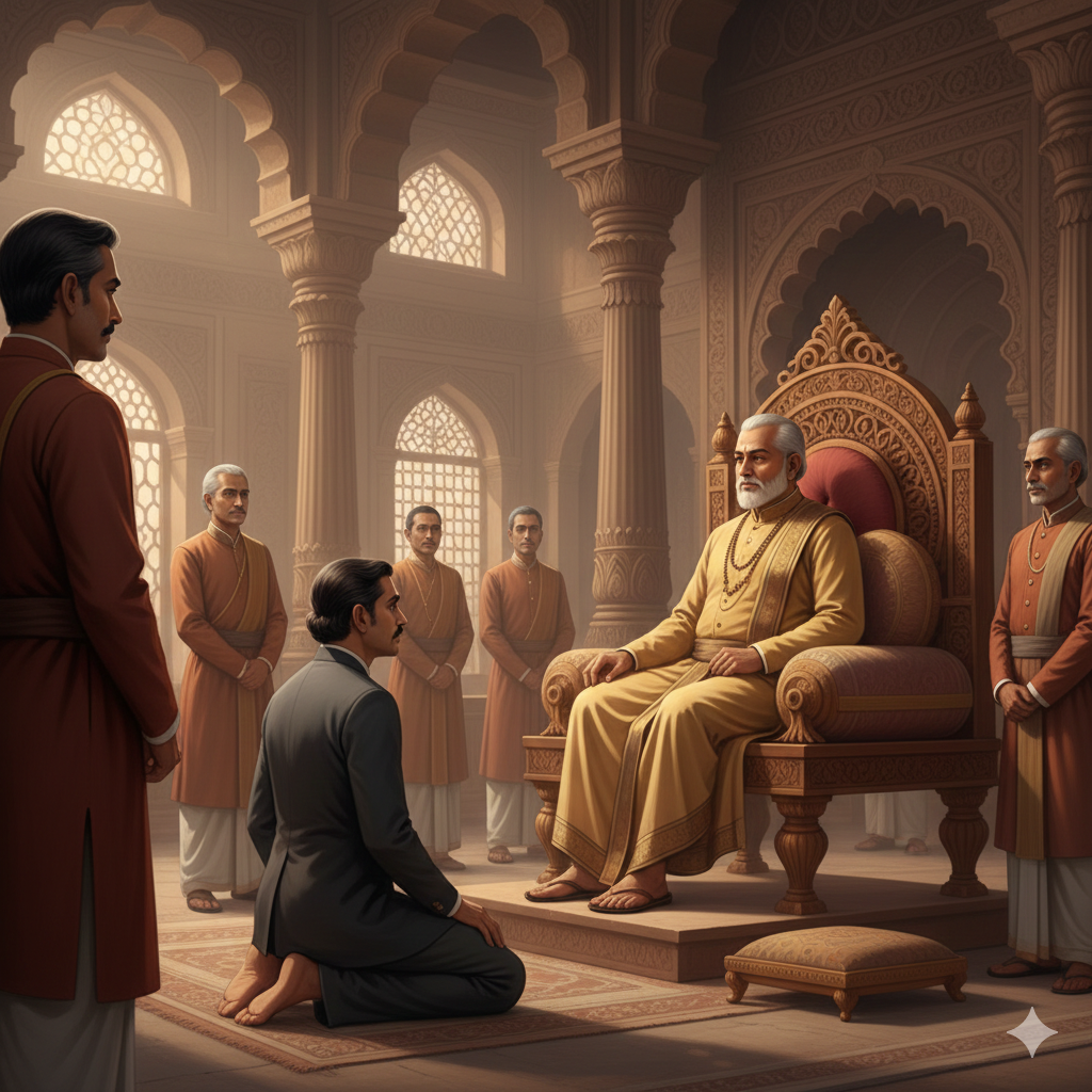 - [English] King Ashoka sits on his throne, while Minister Yashiya, in neat attire, kneels before him. The king, with a stern expression, points in a specific direction as he gives a command. Yashiya looks up at the king, his face a mix of bewilderment and tension. Other ministers watch nervously in the background. Google Nano Banana style.