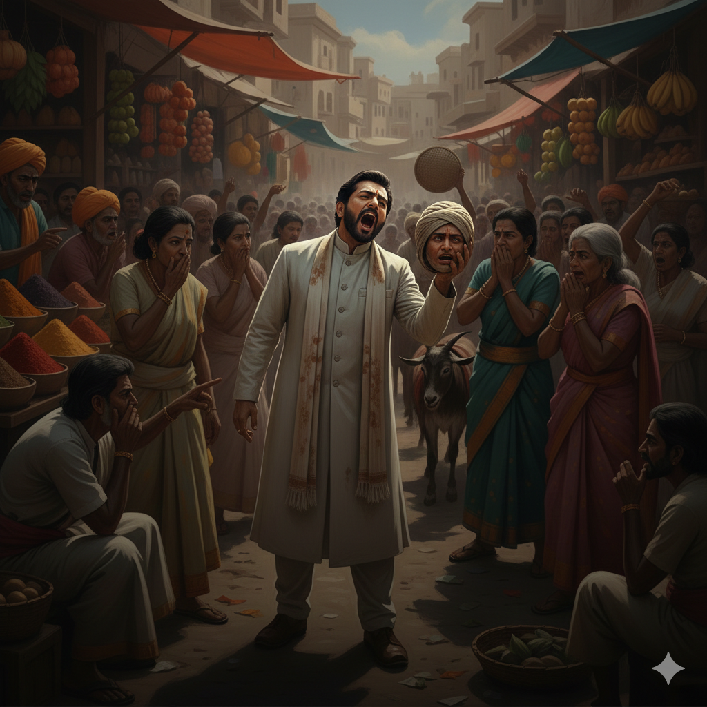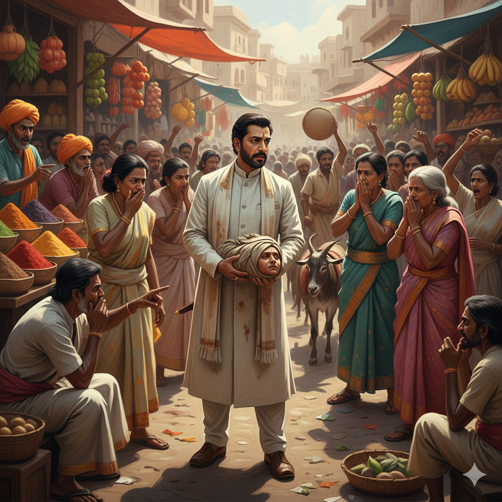 - [English] In a bustling ancient Indian market, Minister Yashiya, in neat attire, stands awkwardly amidst various merchants and people. In his hand, he holds what appears to be a human head wrapped in cloth. Surrounding vendors and passersby avoid him or point and hurl insults with expressions of disgust. The lively market forms a chaotic backdrop for Yashiya. Google Nano Banana style.