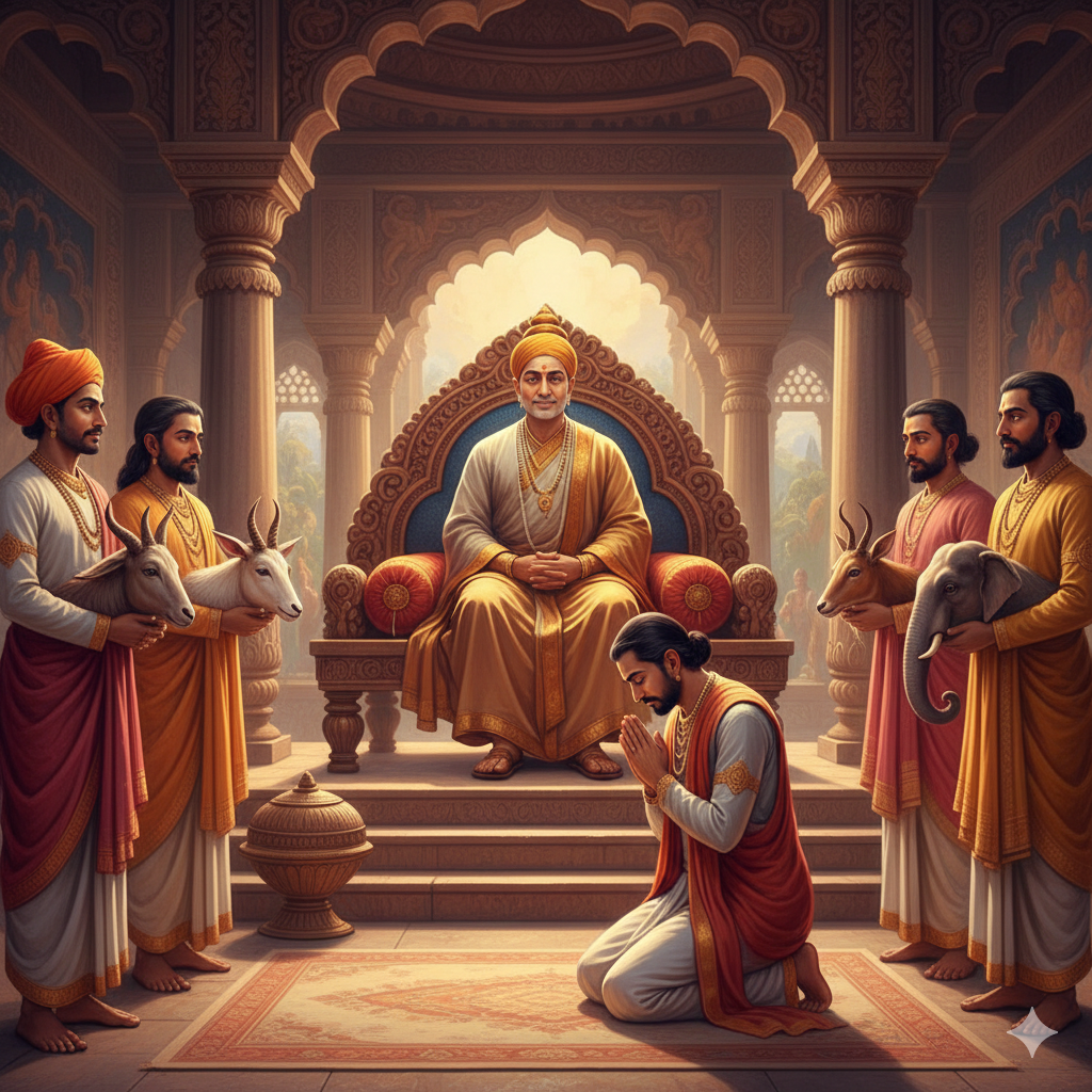 [English] Inside a serene royal palace, the benevolent King Ashoka sits on a dais, while Minister Yashiya, with hands clasped, bows his head before him. Beside them, other ministers, dressed in neat attire, stand holding various animal heads. The overall scene conveys an emotional atmosphere in the style of Eastern painting. The king displays a wise and compassionate expression, while Yashiya wears a humble, enlightened look. (89 words)