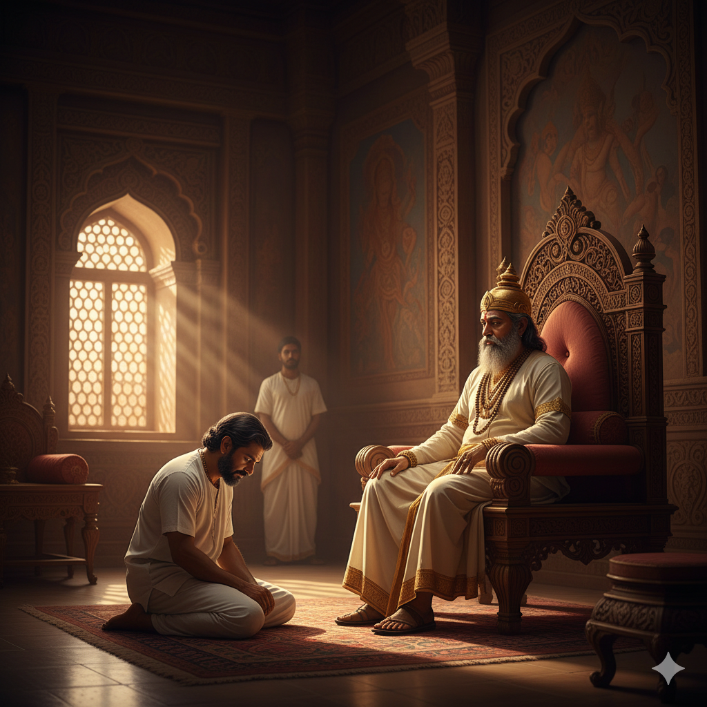 - [한글] 왕의 개인 접견실, 아쇼카왕이 근엄한 표정으로 왕좌에 앉아 있고, 야시야 대신이 단정한 복장을 한 채 무릎을 꿇고 힘없이 보고를 하고 있다. 그의 표정에는 깊은 좌절감이 묻어 있으며, 왕은 그의 보고를 조용히 듣고 있다. 방 안의 분위기는 무겁고 진지하다. 구글 나노 바나나 스타일로.