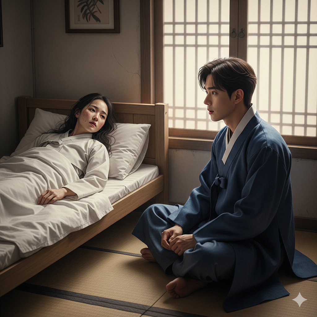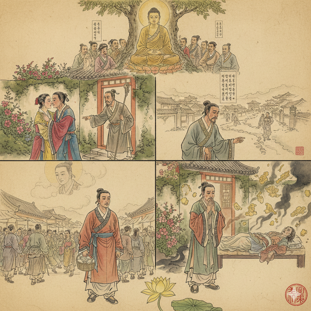 - 이미지 정보: 고요한 동양화풍 침실에서, 단정하게 옷을 입은 부잣집 아들이 병색이 완연하고 초췌하게 변한 아내를 마주 보고 있다. 아들의 얼굴에는 충격과 함께 애욕이 사라지고 명징해지는 깨달음의 빛이 서서히 드리워진다. 추하고 애처로운 아내의 모습과 그 앞에서 변해가는 아들의 감정이 대비되도록 표현한다.