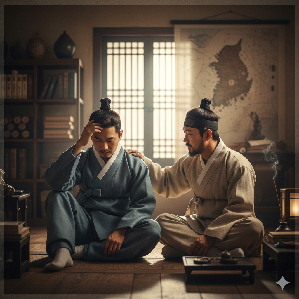 - 이미지 정보: 고즈넉한 동양화풍 서재에서, 단정하게 옷을 입은 부잣집 아들이 시름에 잠겨 고뇌하는 표정으로 앉아 있다. 그 옆에는 역시 단정한 옷을 입은 친구가 따뜻하지만 진지한 표정으로 아들의 어깨에 손을 얹고 지혜로운 조언을 건네는 모습. 배경에는 책들과 지도가 흐릿하게 보인다.