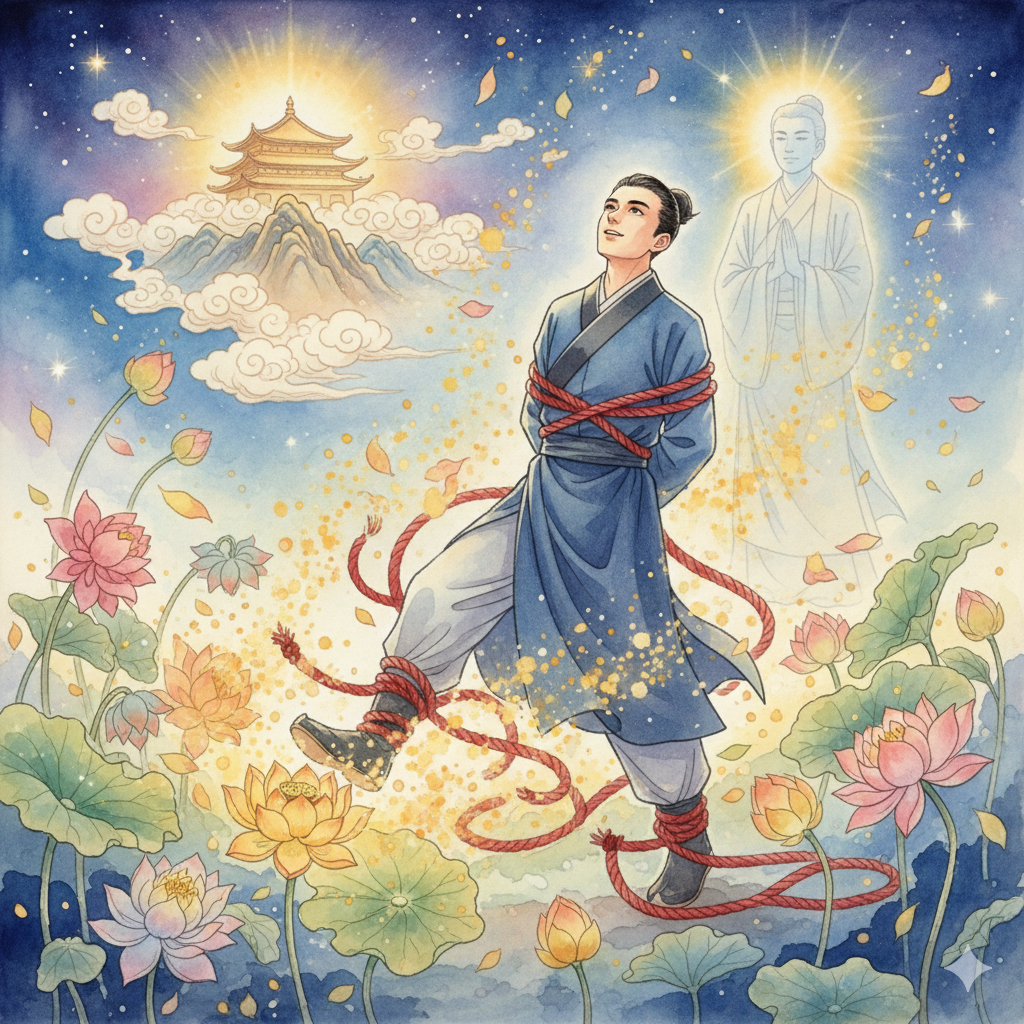 ✨ 시와 메시지를 아우르는 이미지 생성 정보: 고요하고 영적인 동양화풍 배경에서, 단정하게 옷을 입은 젊은 남자가 고통스럽게 자신을 옥죄던 붉은 고삐를 끊어내고 환희에 찬 표정으로 하늘을 올려다보고 있어요. 그의 주변에는 덧없이 시들어가는 화려한 꽃들과, 그 고삐를 풀고 남자가 발을 내딛는 곳에서 피어나는 은은한 황금빛 연꽃이 대비를 이룹니다. 멀리 고요한 산사에서 지혜의 빛이 드리우고, 남자의 뒤에는 모든 번뇌가 소멸하고 평온해진 모습의 투명한 실루엣이 나타나는 추상적인 콜라주 이미지. 희망과 해방감을 강하게 표현해주세요.