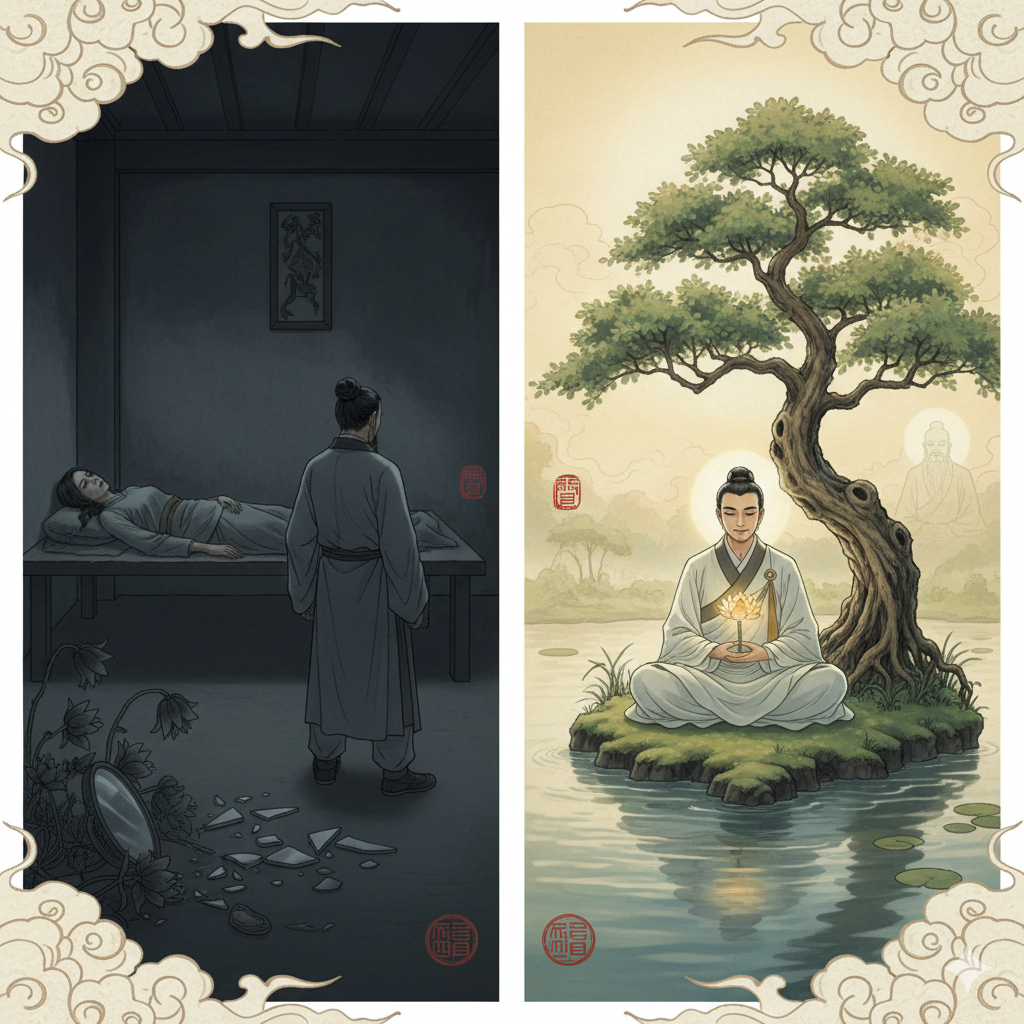 - 우측 (긍정적 면): 밝고 따뜻한 색감으로, 빛이 환히 비추는 평화로운 연못가에 한 남성(단정한 옷)이 고요히 앉아 명상하는 모습. 그의 얼굴에는 온화한 미소가 드리워져 있고, 손 위에는 환한 빛을 발하는 연꽃 한 송이가 피어납니다. 배경에는 강인한 생명의 나무가 우뚝 서 있고, 남성 뒤편으로 희미하게 빛나는 지혜로운 스승의 실루엣이 나타나 내면의 깨달음과 성장의 희망을 상징적으로 보여줍니다.