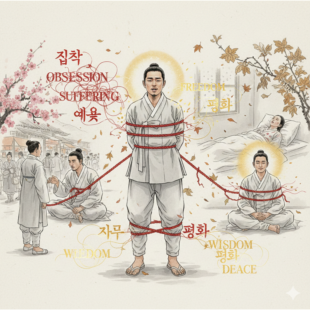 ✨ 종합적인 이미지 생성 정보 (배울 점, 시사점 등): 고요하고 영적인 동양화풍 배경에서, 단정하게 옷을 입은 젊은 남자가 환한 빛이 뿜어져 나오는 지혜의 책을 들고 고요히 명상하고 있어요. 그의 주위에는 얽혀있던 애욕의 고삐와 덧없이 시들어가는 아름다운 꽃들이 사라지고, 대신 단단한 뿌리를 내린 생명의 나무와 잔잔한 연못이 평화롭게 펼쳐집니다. 이 이미지는 애욕에서 벗어나 무상함을 통찰하며 내면의 지혜와 평화를 얻어, 흔들림 없는 시선으로 세상을 바라보는 현대인의 성숙한 모습을 보여주는 콜라주 이미지로 표현해주세요.