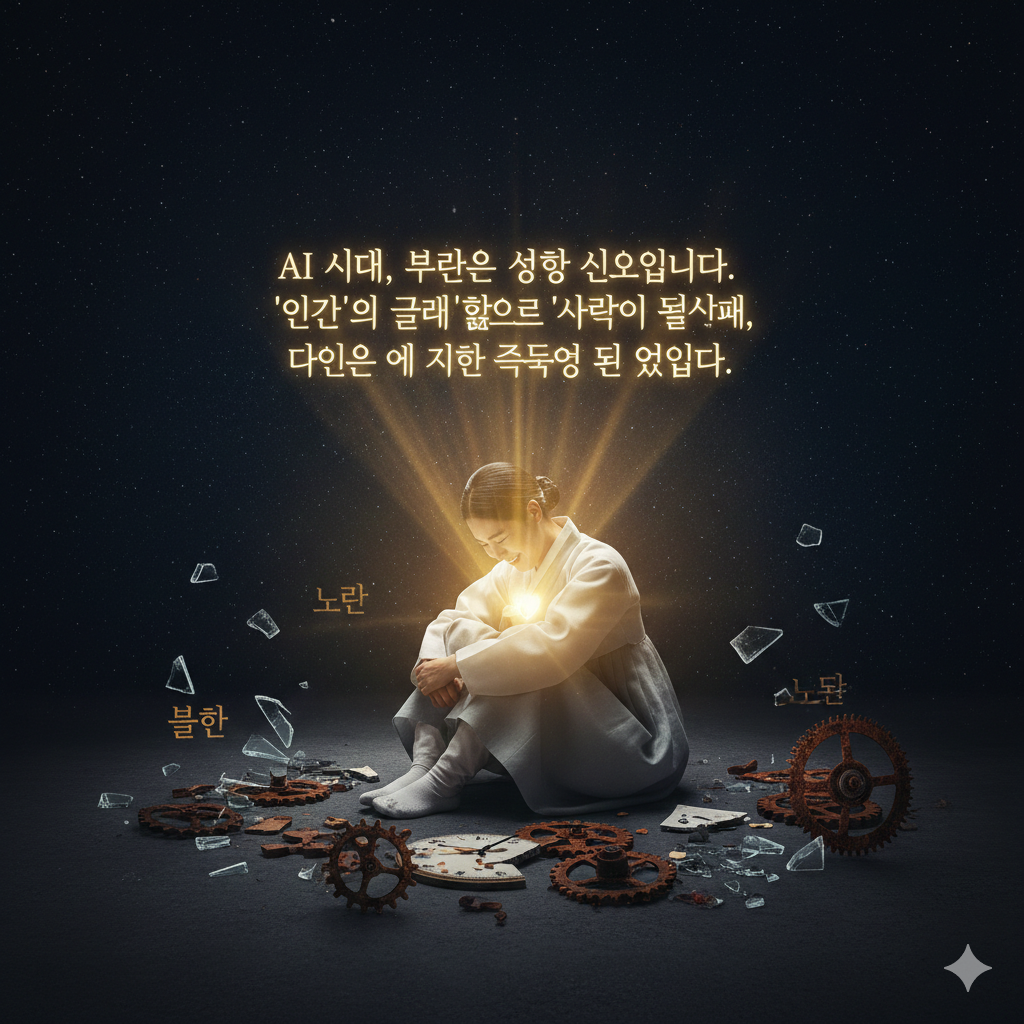 한글 (Korean - ~290자): 고요하고 영적인 동양화풍의 우주 공간. 중앙에 단정하게 옷을 입은 사람이 깊은 고뇌에 잠겨 주저앉아 있습니다. 그 주변으로는 낡은 시계 부품들과 함께 '불안', '노동'이라는 글자들이 깨진 유리 조각처럼 어지럽게 흩어져 있습니다. 이때 그 사람의 심장에서 밝은 빛이 솟아나오며 'AI 시대, 불안은 성장의 신호입니다. '인간'의 굴레를 벗고 '문화 활동'으로 '사람'이 될 때, 당신은 이 시대의 진정한 주인공이 될 것입니다.'라는 핵심 글귀가 황금색으로 빛나는 홀로그램처럼 떠오릅니다. 글귀가 퍼져나가며 주저앉았던 사람이 일어서서 환한 미소와 함께 새로운 '문화 활동'의 빛을 발산하는 구글 나노 바나나 스타일의 영적이고 희망찬 콜라주입니다.