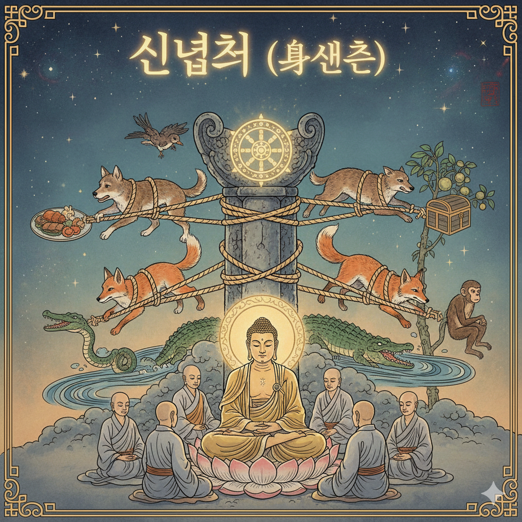 English Summary: Shakyamuni Buddha taught his disciples about how our minds are swayed by sensory desires and the path to inner peace, using the analogy of six animals. Just as a dog, bird, snake, fox, crocodile, and monkey, each longing for different environments, are tied to a single sturdy pillar and cannot escape despite their struggles, humans are constantly swayed by the desires of their six sense organs (eye, ear, nose, tongue, body, mind). However, just as the animals eventually tire and rest by the pillar, Buddha emphasized that by practicing 'Shin-nyeom-cheo' (mindfulness of the body) and contemplating its impermanence, we can free ourselves from sensory pleasures and attain true peace and liberation.