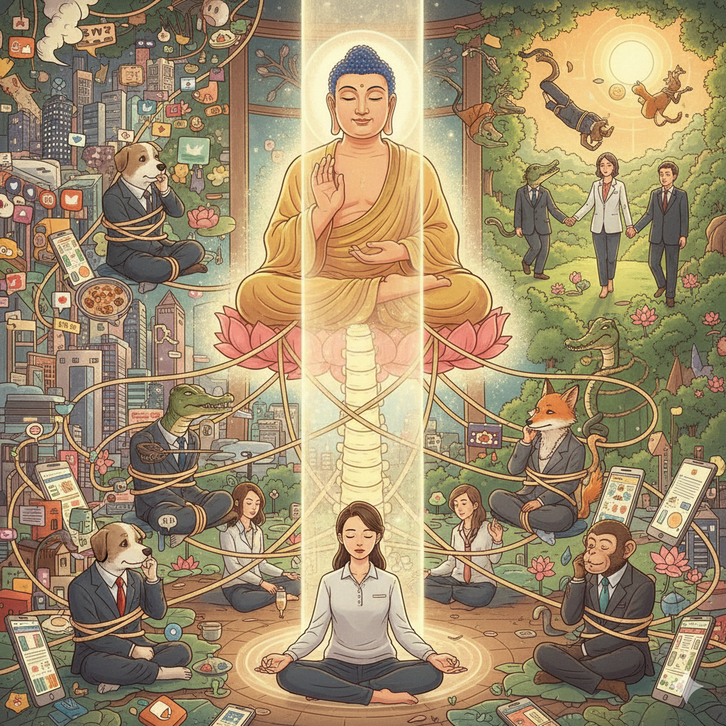 English: A fantastical and warm Google Nano Banana style collage. At the center, Shakyamuni Buddha, with a benevolent smile, is set against a serene Kushira Vihara backdrop, with light radiating from his hands, enveloping the entire image. The bottom left features a modern city skyline, cluttered with elements symbolizing contemporary desires (social validation, achievement, security, power, pleasure, distraction): social media icons, luxury brand logos, food images, glittering buildings, and endlessly scrolling smartphone screens. These desires are depicted as ropes, binding six animals (dog, bird, snake, fox, crocodile, monkey) each dressed in neat modern attire, struggling against their tethers. Their expressions convey exhaustion and anguish. Centrally, all these ropes of desire converge into a majestic pillar of light, symbolizing 'Shin-nyeom-cheo.' This light pillar stands firm like the spine of a meditating modern individual, emitting a transparent glow. Around it, neatly dressed men and women, weary from burnout and anxiety, meditate with closed eyes, regaining peace, enveloped by Buddha’s light. The top right shows liberated animals frolicking freely in lush nature, lotus flowers of enlightenment blooming, and people with peaceful smiles walking hand-in-hand under warm sunlight. All characters are neatly dressed. (approx. 300 words)