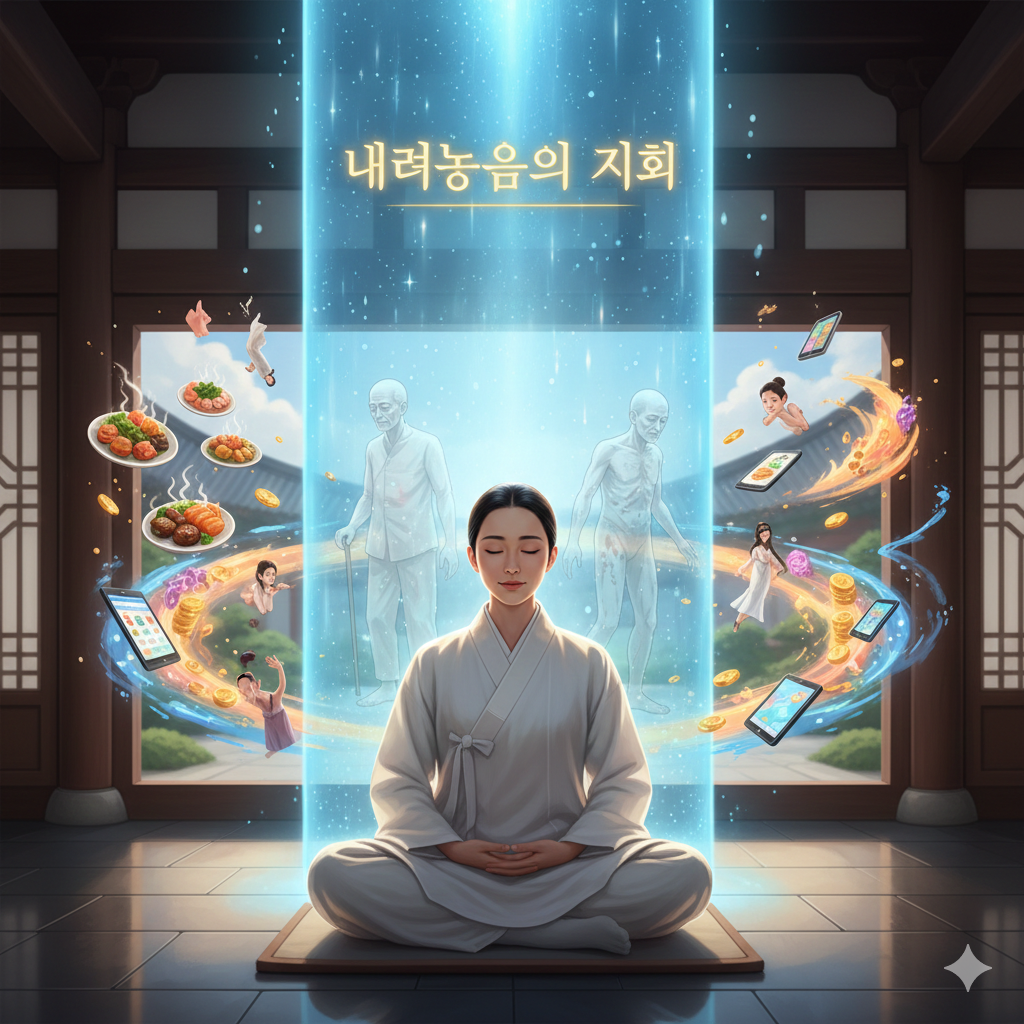 한글: 명암 대비가 뚜렷한 동양화풍의 콜라주 이미지. 화면 중앙을 가로지르는 은은한 빛의 선을 경계로 좌우가 대조됩니다. 왼쪽(부정적): 어둡고 혼란스러운 배경에 낡고 부서진 시계 태엽, 무너진 종교 시설이 얽혀있고, 감각적 쾌락(스마트폰, 명품, 미식 등)을 쫓다 지쳐 쓰러진 듯한 단정한 옷차림의 현대인들이 욕망의 밧줄에 얽매여 고뇌하는 모습입니다. 오른쪽(긍정적): 밝고 평온한 배경에 굳건한 빛 기둥(신념처)이 솟아 있고, 그 주위에서 육체적 무상함을 받아들이며 평온한 미소를 지은 단정한 옷차림의 사람들이 명상하며 자유롭게 서 있습니다. 그들의 육체는 투명한 빛으로 빛나고, 빛 기둥 꼭대기에서는 깨달음의 연꽃이 피어납니다. (약 300자)