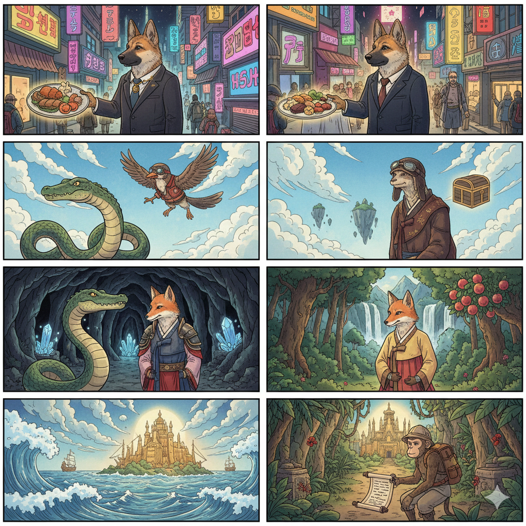 이미지 생성 프롬프트: 한글: 각기 다른 배경(개는 도시, 새는 푸른 하늘, 뱀은 어두운 굴, 여우는 울창한 산, 악어는 넓은 바다, 원숭이는 역동적인 숲)을 등지고 선 여섯 동물들이 개성 있는 옷차림으로 자신의 욕망을 표현합니다. 모두 간절한 눈빛으로 자신이 원하는 곳을 바라봅니다. (약 130자) English: Six animals in distinctive outfits stand against varied backdrops (dog in city, bird in blue sky, snake in dark cave, fox in lush mountains, crocodile in vast sea, monkey in dynamic forest). All express their desires with yearning eyes, gazing at their longed-for places. (approx. 130 characters)