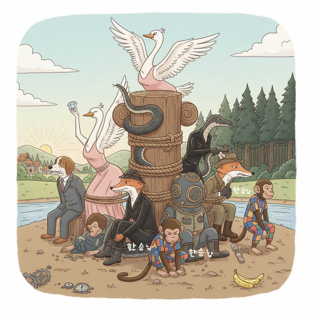 이미지 생성 프롬프트: 한글: 견고한 나무 기둥에 두꺼운 밧줄로 묶인 채, 다채로운 옷을 입은 여섯 동물들이 각자의 방향으로 격렬하게 몸부림치고 있어요. 개는 마을을, 새는 하늘을 향해 발버둥 칩니다. 하지만 결국 지쳐서 기둥 밑에 옹기종기 모여 앉아 좌절한 표정으로 한숨을 쉬고 있습니다. (약 130자) English: Six animals, vividly dressed, are tied by thick ropes to a sturdy wooden pillar, desperately pulling in different directions. The dog struggles toward the village, the bird flutters toward the sky. Eventually, all sit exhausted at the base of the pillar, sighing with expressions of despair. (approx. 130 characters)