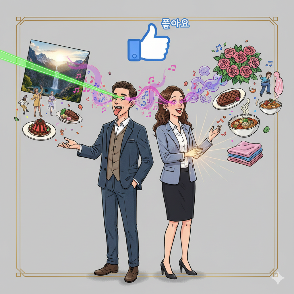 이미지 생성 프롬프트: 한글: 한 남녀가 현대적인 옷을 단정하게 입고 서 있습니다. 남자의 눈에서는 아름다운 풍경을 향한 레이저가, 귀에서는 달콤한 음악이, 코에서는 향긋한 꽃향기가, 혀에서는 맛있는 음식이, 손에서는 부드러운 촉감이, 머리 위로는 '좋아요' 표시가 뿜어져 나오며 감각적 집착을 익살스럽게 표현합니다. (약 130자) English: A man and woman in neat modern attire stand. From his eyes, lasers aim at beautiful scenery; from his ears, sweet music plays; from his nose, fragrant floral scents emanate; from his tongue, delicious food appears; from his hands, soft textures; and above his head, "likes" burst forth, whimsically depicting sensory attachment. (approx. 130 characters)