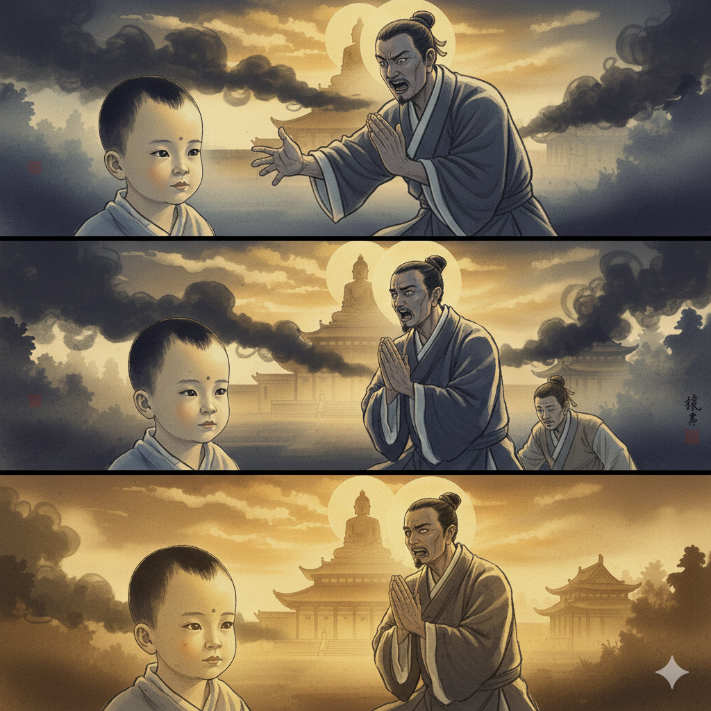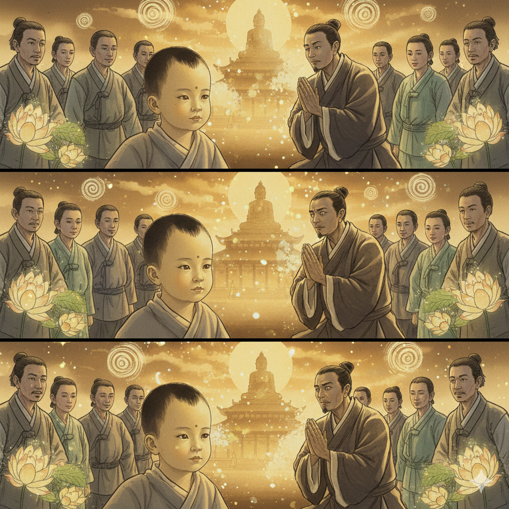 - 이미지 생성 정보 — 한국어 (약 300자) 구글 나노 바나나 스타일: 황혼빛 기원정사 마당 파노라마. 중앙에 순수한 얼굴의 어린 무해(정면 클로즈업)와 바라문(전신)이 서 있고, 주변에 마을 사람들이 둥글게 모여 있다. 공중의 검은 독기 연기가 바라문의 절절한 외침과 함께 파동형의 황금빛 에너지로 변해 연꽃과 햇빛 입자로 치유되는 연속 장면. 색감은 골드·연녹·인디고 대비, 텍스처는 수묵·수채 혼합 콜라주, 인물들은 단정한 전통·현대 혼합 의상, 카메라: 파노라마→클로즈업 전환, 해상도: 4K cinematic.