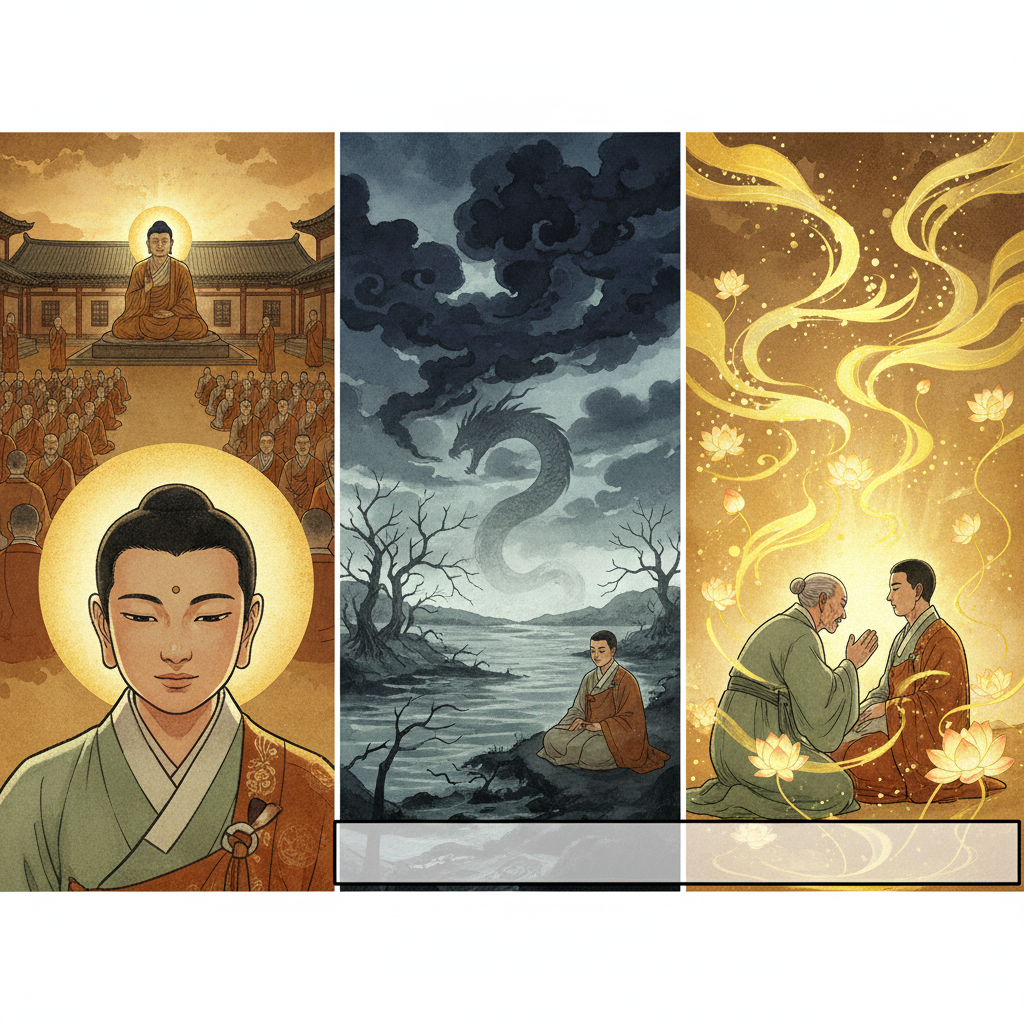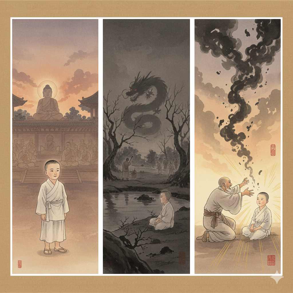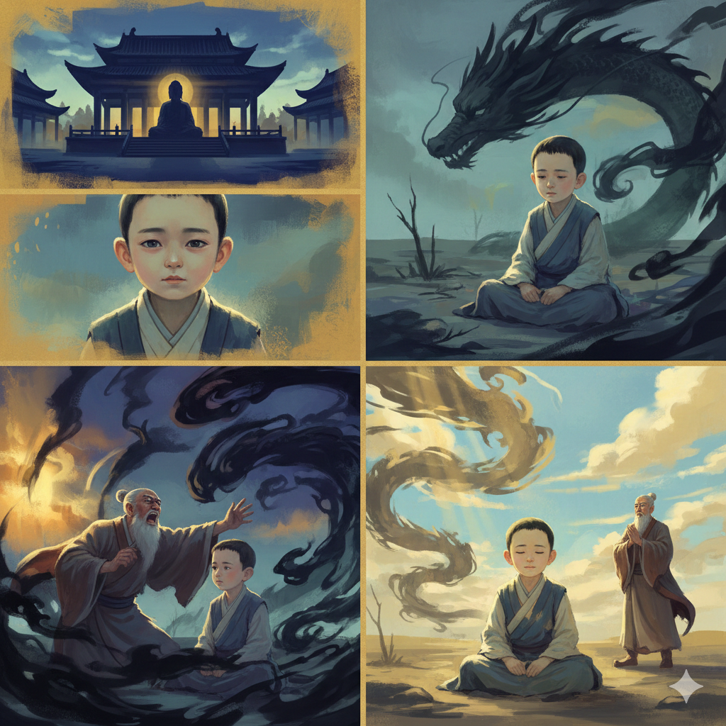 - English (about 300 characters) A tranquil temple dusk: the Buddha’s silhouette teaching at the monastery while young Muhyeo stands pure and luminous in the foreground. A barren spring with a faint dragon shadow, Muhyeo sitting resigned—then his father’s desperate cry dispels black poisonous mists, sunlight returns to Muhyeo’s face. Rendered in warm Eastern-painting collage; all figures dressed in modest clothing.
