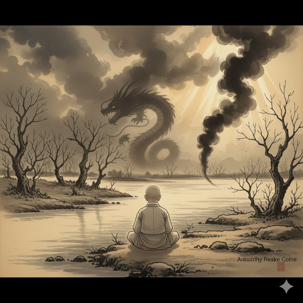 - 한국어(프롬프트) 구글 나노 바나나 스타일: 고요한 사원 저녁 풍경, 법당 앞 석존이 설법하는 실루엣과 순수한 얼굴의 어린 무해 클로즈업, 이어 황량한 샘가에 앉아 있는 무해, 독룡의 흐릿한 그림자와 검은 독기 연기, 바라문이 애타게 외치는 순간, 독기가 걷히고 햇빛이 무해를 비추는 장면 — 따뜻한 동양화풍 콜라주, 색감은 황금·푸른빛 혼합, 인물들은 단정한 전통·현대 혼합 의상 착용, 감성적이고 서사적 조명 연출, 고해상도.