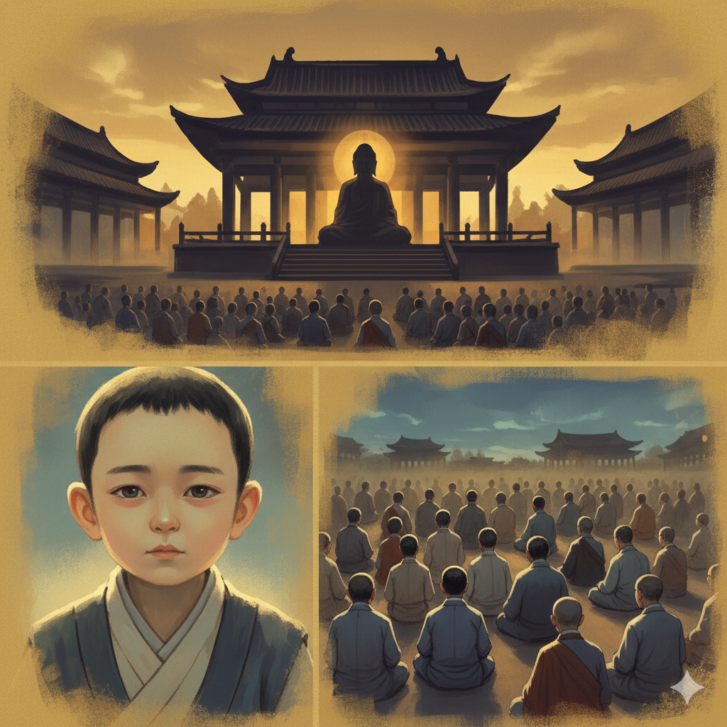 - English Scene: panorama of Gy원Jeongsa courtyard with seated audience. Camera angle: wide low-angle panorama to emphasize the hall and Buddha silhouette. Cut: slow zoom to medium close on young Muhyeo’s face among crowd. Lighting: soft sunset golden light, silhouette emphasis. Colors: warm gold + peach tones, accents of soft blue. Texture: ink-wash brush texture. Clothing: modest traditional-modern attire. Resolution: 4K, cinematic DOF.