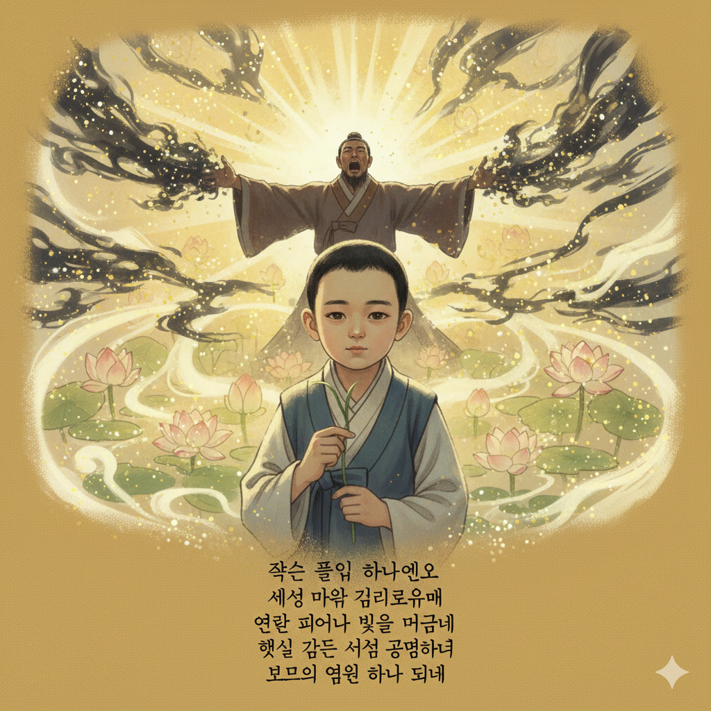 - 이미지 생성 정보(시를 아우르는 종합 프롬프트) — 한국어 (약 300자) 구글 나노 바나나 스타일: 콜라주형 포스터—전경에는 어린 무해가 풀잎을 조심스레 들고 있는 포트레이트, 중앙엔 바라문이 외치는 역동적 실루엣, 배경엔 검은 독기가 파동으로 빛으로 바뀌는 흐름과 연꽃, 햇빛 입자들이 레이어로 쌓인다. 시구(붓글씨) 8행이 이미지 하단에 한 줄씩 흐르듯 배치되어 강의 캡션 역할을 함. 색감: 골드·연녹·인디고 대비, 텍스처: 수묵·수채 혼합 콜라주, 인물들은 단정한 전통·현대 혼합 의상, 포스터용 4K 해상도.