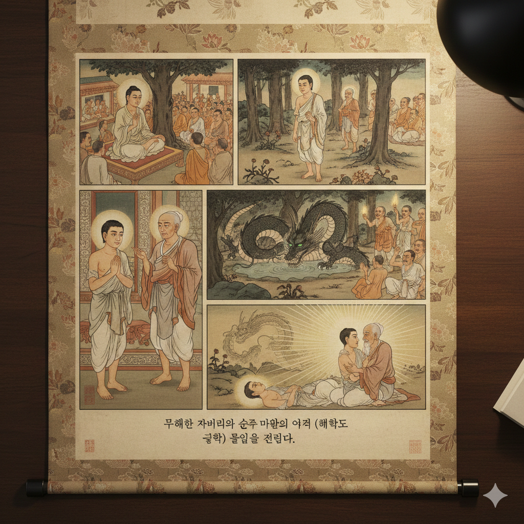 - 한국어(300자 내외) 고요한 사원 배경의 저녁빛, 기원정사 앞마당에서 설법하는 석존의 실루엣이 보이고 전경엔 어린 무해가 밝고 순수한 표정으로 서 있다. 이어 샘가의 황량한 풍경과 독룡의 어렴풋한 그림자, 무해가 앉아 있는 장면, 마지막으로 바라문이 아들을 향해 절절히 외치자 공중의 독기(검은 연기)가 사라지고 무해의 얼굴에 햇빛이 비추어 회복되는 연속 장면을 따뜻한 동양화풍으로 표현. 인물 모두 단정한 옷을 입고 있음.