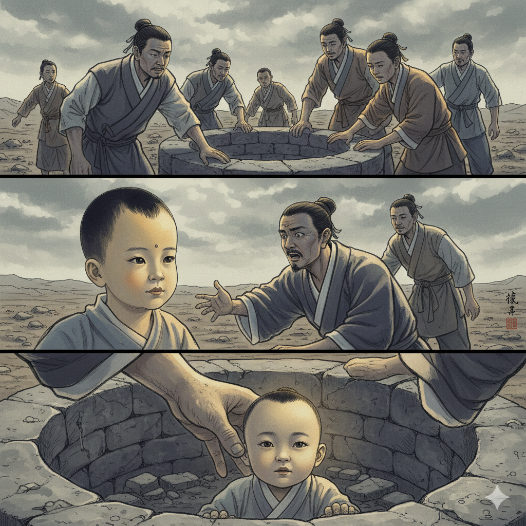 여러 사람이 샘가 주변을 수색하고 있는 장면. 한 인물이 샘가 가장자리에 앉아 창백한 얼굴의 무해를 발견하는 순간을 클로즈업. 주변 인물들의 놀람과 걱정이 드러나며 조명은 어둡고 긴장감 있음. 인물들은 단정한 옷을 입음. - English (about 300 chars)