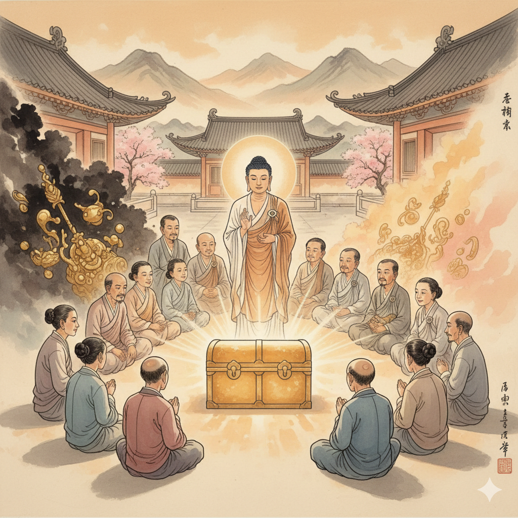 고요하고 신비로운 사밧티국 기원정사의 마당, 단정한 복장의 부처님이 중심에 서서 설법하는 모습. 부처님 주변에는 가족과 이웃을 상징하는 인물들이 따뜻한 표정으로 조화롭게 모여 있다. 중앙에는 네 등분된 황금빛 재산 상자가 있으며, 왼편으로는 화려하지만 어둡게 빛나는 탐욕의 그림자가 대비를 이루고, 오른편으로는 따뜻한 자비와 나눔의 빛이 은은하게 퍼져나가는 장면을 동양화풍으로 표현하였다.