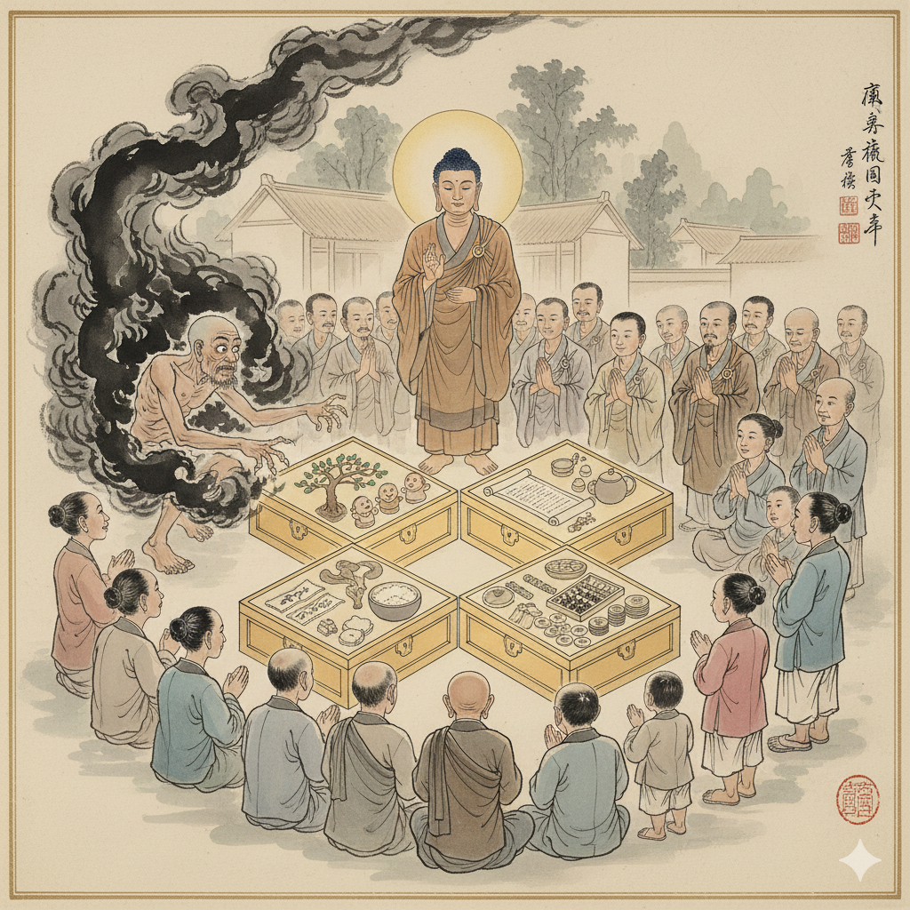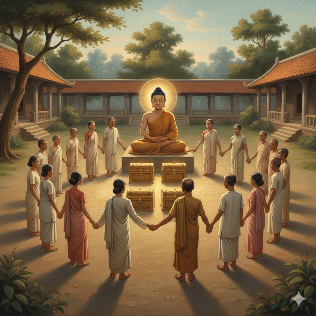 English: In a serene ancient temple courtyard, Buddha and family, neighbors, relatives dressed neatly gather around four golden sections representing balanced distribution. A peaceful Eastern painting style scene with warm natural light radiating compassion, contrasting shadow of greed and ignorance nearby.