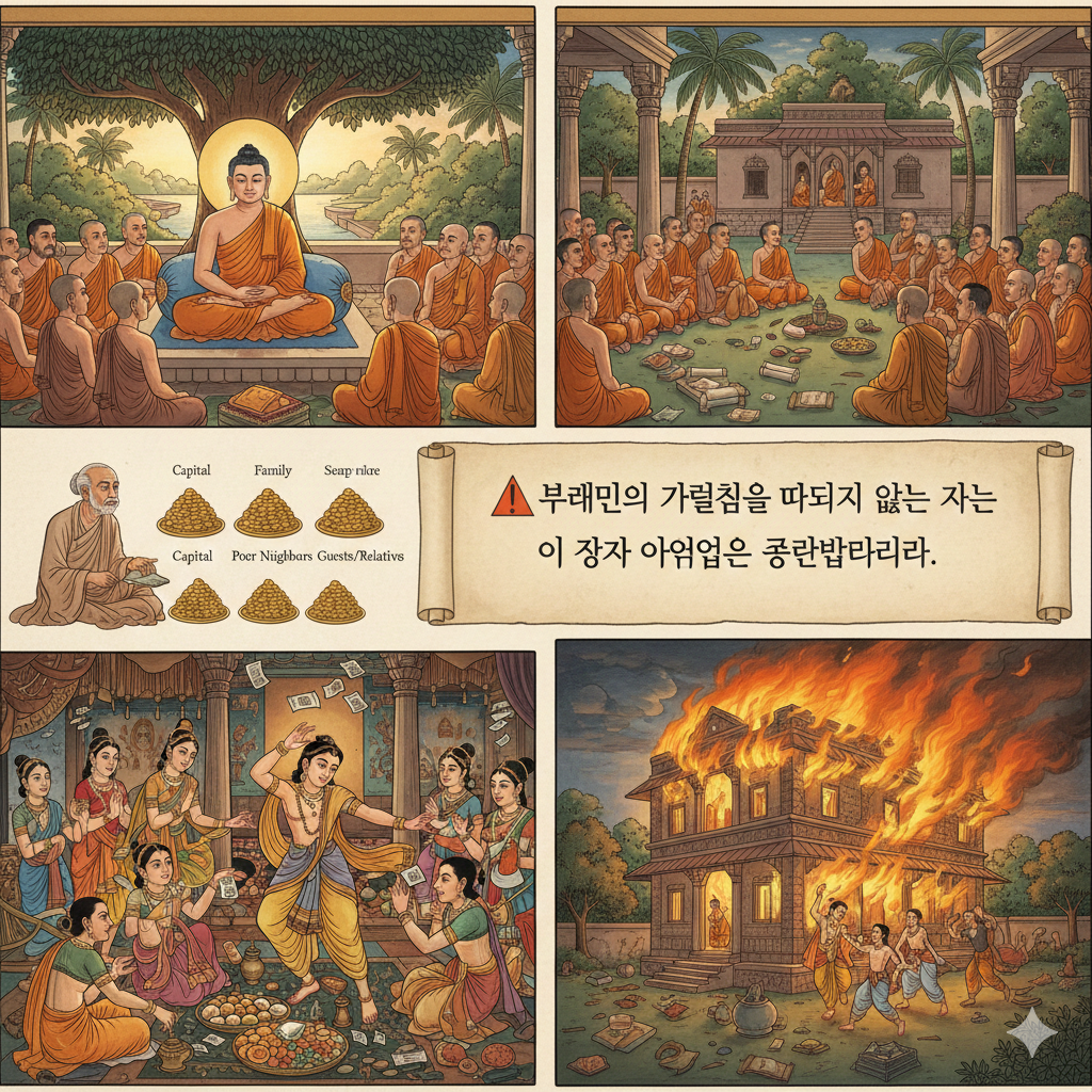 | 결론 | 가문의 전통을 무시하면 파멸에 이르고, 부처님의 가르침을 따르지 않는 자는 업에 빠져 고통받는다는 교훈 전달. | 단정한 옷 입은 부처님이 조용히 설법하며, 고통받는 인간 군상과 빛으로 인도하는 부처님의 자비가 대비되는 동양화풍 이미지. 평화와 엄숙함이 공존. | Buddha in neat robes peacefully preaching. Contrasted with suffering human figures, Buddha's compassion leads with light. Eastern painting style expressing solemn peace. |