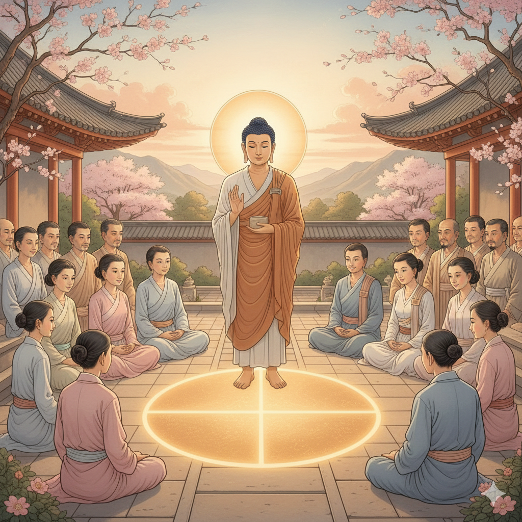 English: In a tranquil temple courtyard, neatly dressed multi-generational figures gather in a circle, sharing golden radiant energy shaped like four paths. Soft natural light and warm colors symbolize hope and compassion in an Eastern painting style.