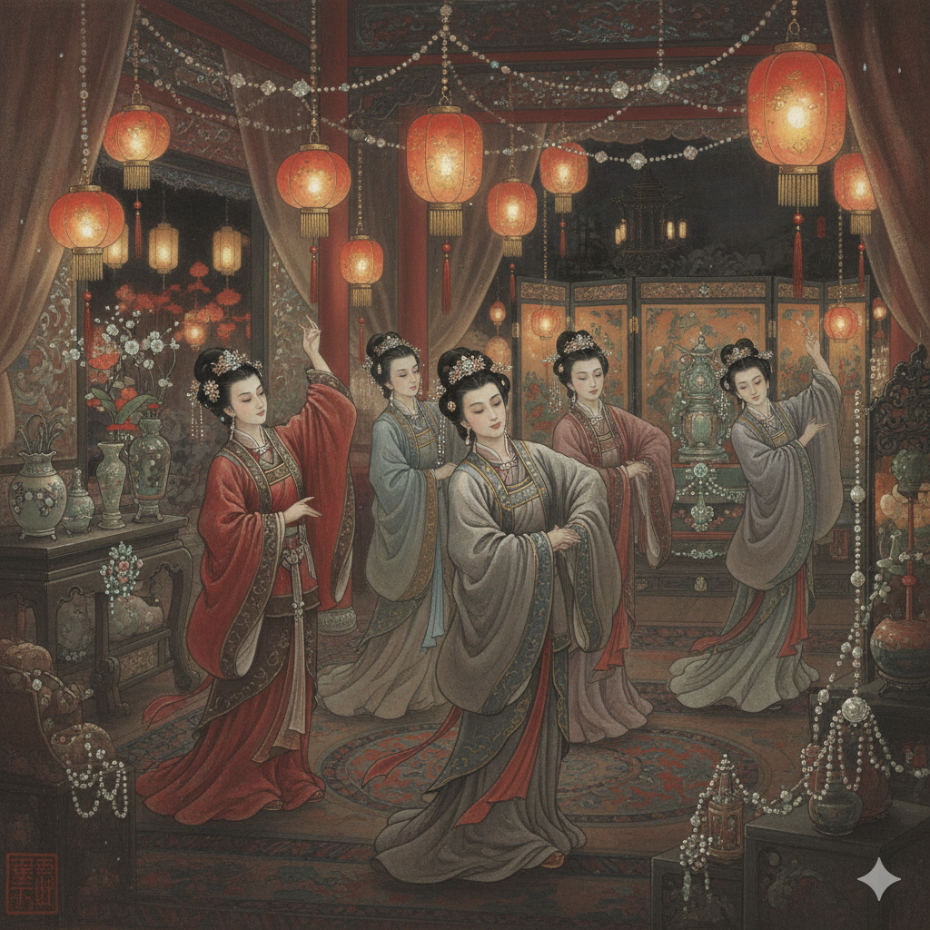 화려하게 꾸민 저택 내부, 단정한 옷을 입은 인물들이 춤추고 노래하는 모습, 빛나는 보석과 환한 조명이 배경, 분위기는 동양화풍으로 우아하지만 어두운 운명을 암시하는 느낌.