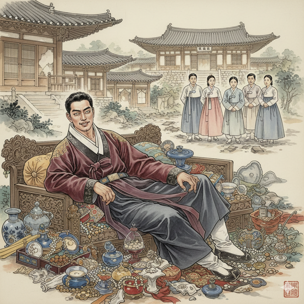 화려한 저택을 배경으로 단정한 옷을 입은 젊은 남자가 욕심에 눈이 먼 표정으로 사치에 빠져 있는 모습, 번영하던 집안의 모습을 대비해 표현. 동양화풍, 인물은 단정하게 복장 착용.