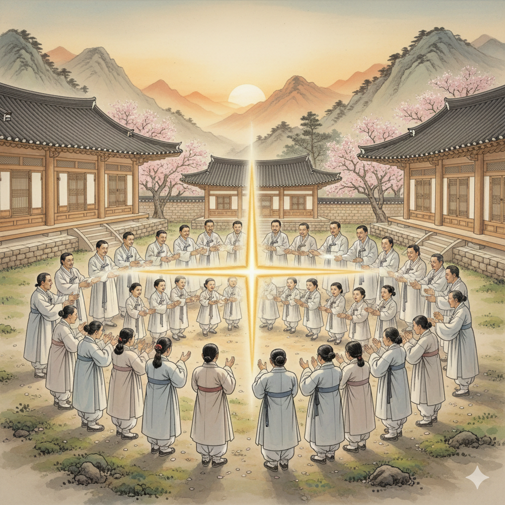 한글: 평화로운 산사 마당에서 단정한 옷을 입은 여러 세대 인물이 둥글게 모여 네 갈래 길 모양의 빛나는 금빛 에너지를 나누며 웃고 있는 동양화풍 그림. 부드러운 자연광과 따뜻한 색채가 희망과 자비를 상징함.