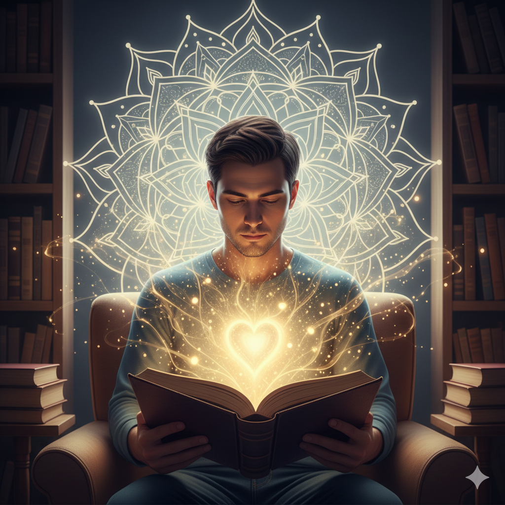 - 한글 이미지 정보: 평온한 디지털 예술입니다. 한 현대인이 책을 읽고 있으며, 책장에서 황금빛 입자(지식)가 솟아올라 읽는 이의 빛나는 심장 속으로 스며듭니다. 배경에는 모든 존재의 연결성을 상징하는 희미한 우주적 만다라가 보입니다. 분위기는 평화롭고 영감을 주며 지적입니다.
