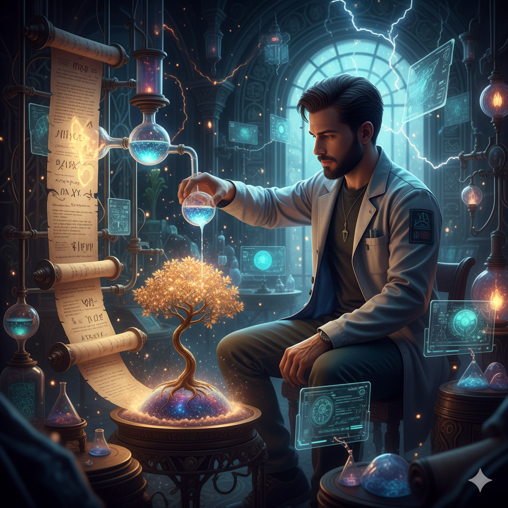 - 한글 이미지 정보: '지식의 연금술사'라는 제목의 개념 예술입니다. 현대의 탐구자가 고대 연금술과 미래 기술이 혼합된 실험실에 앉아 있습니다. 그들은 고대 두루마리에서 빛나는 글자와 상징들을 추출하여 찬란한 빛의 엘릭서로 증류한 뒤, 자신의 영혼을 상징하는 작은 황금 나무에 붓고 있습니다. 분위기는 집중되어 있으며 신비롭고 지적입니다.