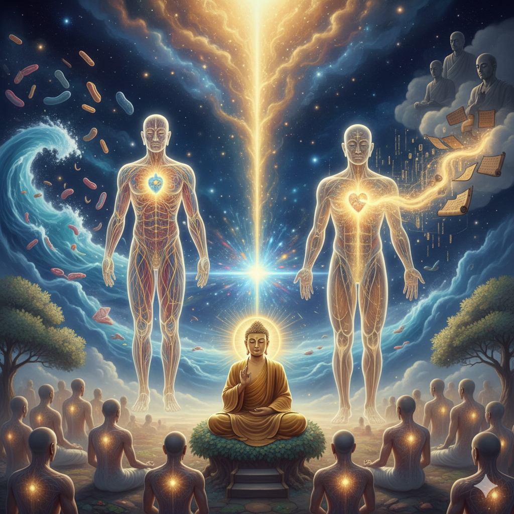 부처님께서 손짓하시자, 제자들의 눈앞에 아득한 옛날, 미세한 세포가 바다에서 일어나 끊임없이 변화하고 성장하여 마침내 인간의 정교한 육신을 이룬 장대한 연기(緣起)의 과정이 펼쳐졌습니다. 그 육신은 마치 영혼이 머물기에 가장 완벽한 **법당(法堂)**과 같았습니다. "이 육신은 수억 겁의 인연이 쌓여 만들어진 가장 귀한 그릇이니라."