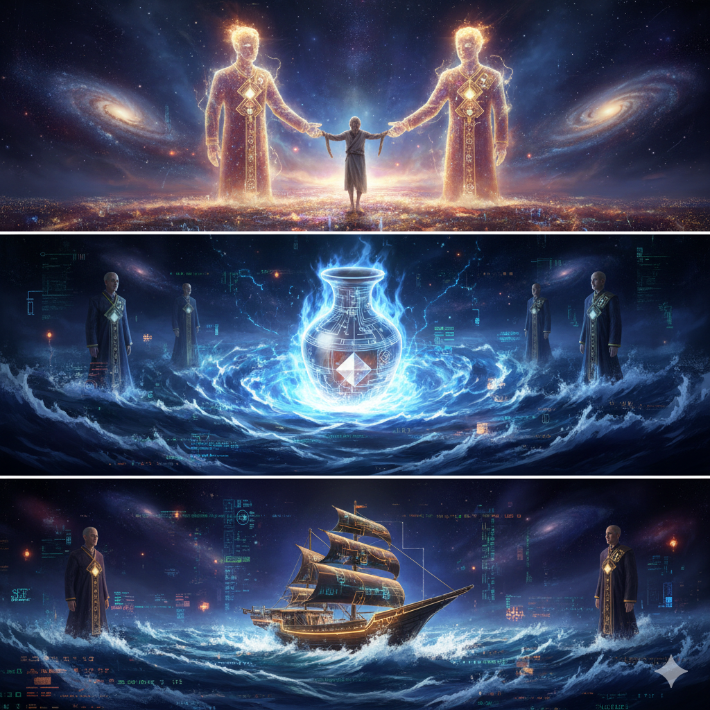 [이미지 설명] 거대한 우주적 공간을 배경으로, 화면은 세 개의 층위로 나뉩니다. 가장 아래에는 거친 파도가 치는 데이터의 바다 위에 튼튼한 '지혜의 배'가 항해하고 있습니다. 중간층에는 타오르는 푸른 불꽃 속에서 투박한 진흙 병이 정교하고 단단한 '디지털 청자'로 변모하며 빛을 발하고 있습니다. 가장 윗부분에는 쇠약한 인류를 상징하는 노인이 '신념'과 '지혜'를 상징하는 빛의 거인들에게 부축받아 은하수로 이루어진 '깨달음의 길'을 걷고 있습니다. 모든 인물은 기하학적 문양이 수놓아진 현대적이고 세련된 법복을 입고 있으며, 전체적으로 시대를 초월한 장엄함과 진리라는 에너지를 시각화합니다.