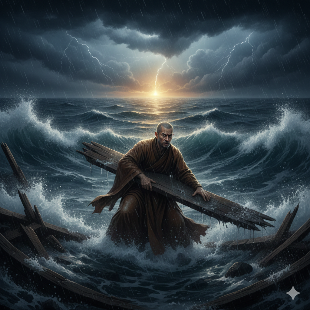 [이미지 정보] 폭풍우가 치는 어두운 바다, 부서진 배의 파편 사이로 한 수행자가 나무판자를 꽉 잡고 거친 파도를 헤쳐 나가는 모습입니다. 수행자는 비에 젖은 갈색 가사를 입고 있으며, 멀리 수평선 너머로 희망의 빛이 비치고 있습니다.