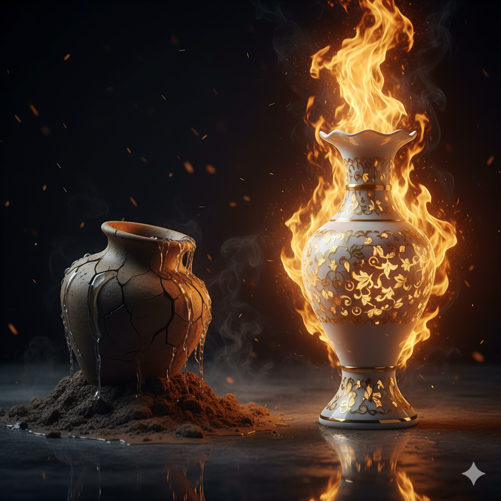 [Image Info] On the left, a crude clay jar loses its shape as water leaks out, contrasted with a sturdy, glowing ceramic vase with intricate patterns on the right. A warm, powerful golden flame burns behind the vase, symbolizing the tempering of wisdom.