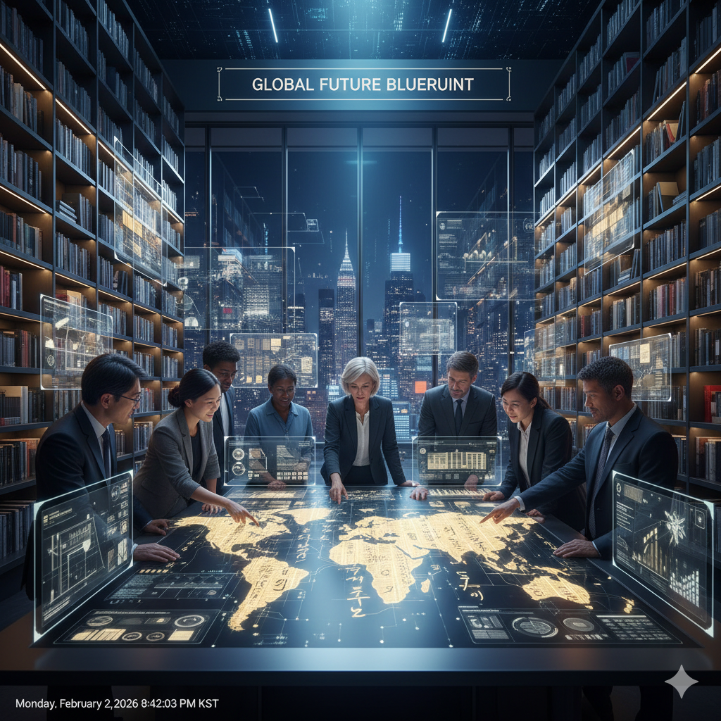 - 설명: 서로 다른 인종의 사람들이 거대한 디지털 도서관(미국 상징) 안에서 한국 전통 붓글씨의 빛으로 된 지도를 보며 함께 미래를 설계하는 모습.