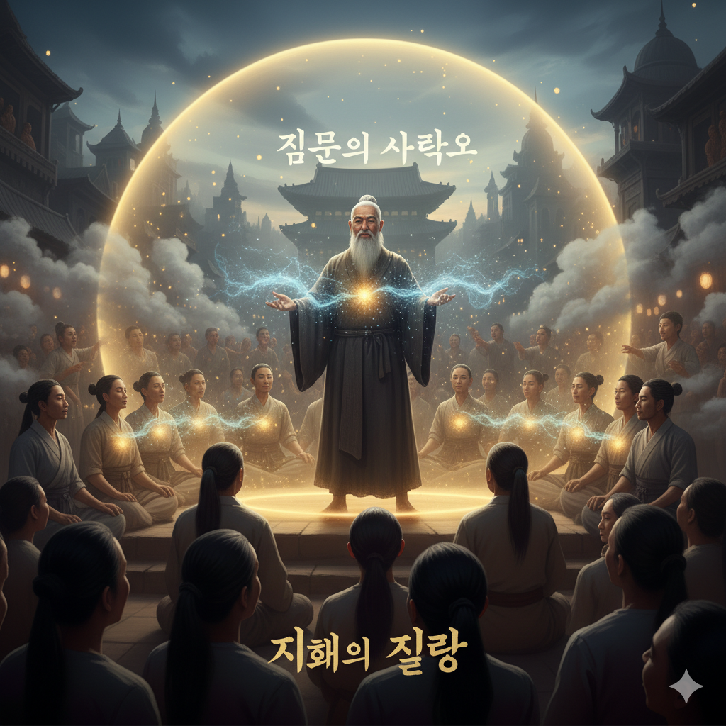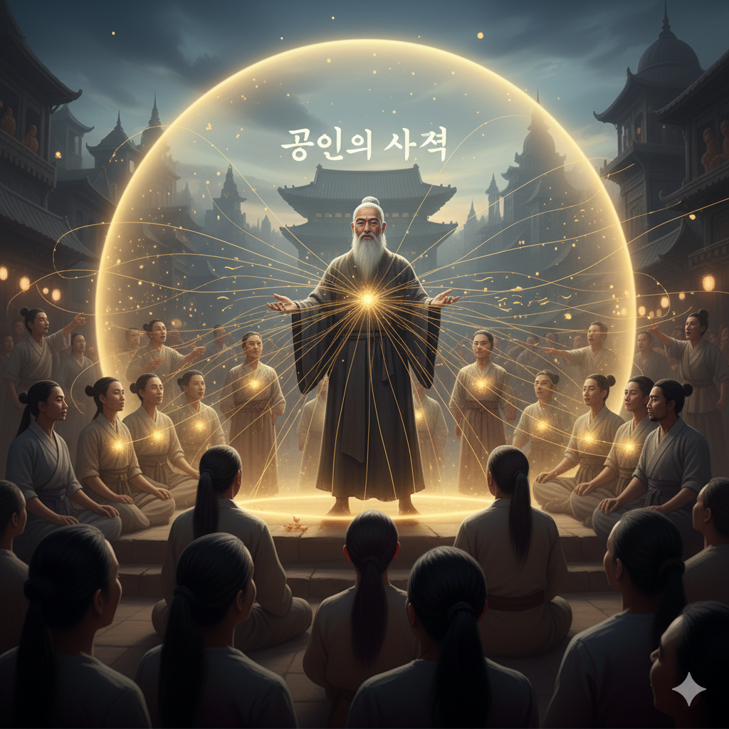 [이미지 프롬프트] A wise, ancient Asian sage with a long white beard, wearing a simple, dark robe, stands on a raised platform in an ancient Asian town square, surrounded by a large, radiant golden sphere of energy. Inside this sphere, a diverse group of people (men and women, young and old) are sitting in silent meditation, each with a subtle golden glow emanating from their chest. From the sage's chest, numerous thin, golden threads of light extend outwards, connecting to the chests of each person within the sphere, symbolizing shared knowledge and purpose. The atmosphere is serene and enlightened. Below the image, "공인의 사적" (Public Figure's Legacy) is written in Korean.