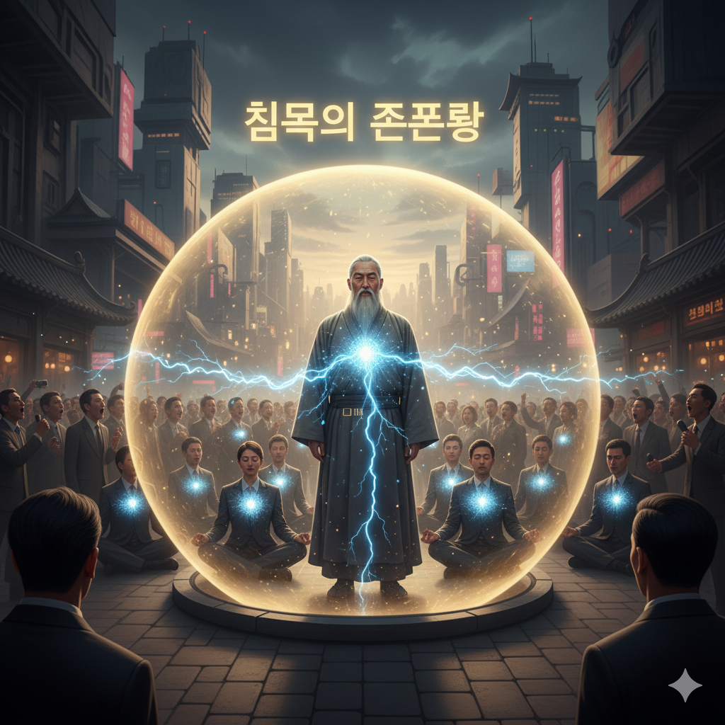 [이미지 프롬프트] A wise, ancient Asian sage with a long white beard, wearing a simple, dark robe, stands at the center of a bustling ancient Asian town square. He is surrounded by a perfect, glowing golden sphere of energy that seems to emanate from his chest. Inside this sphere, a group of diverse people (men and women, young and old) are sitting in silent meditation, absorbing the energy. Outside the sphere, other people are in various states of agitation or complaint, but their words are muted by the sphere. Blue lightning-like energy flows from the sage's chest to the chests of those inside the sphere, symbolizing the transfer of wisdom and peace. Below the image, "침묵의 수행" (Silence's Practice) is written in Korean.