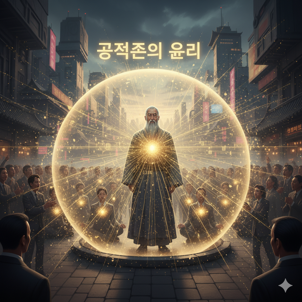 [이미지 프롬프트] An ancient, wise Asian philosopher with a long white beard, wearing a simple, dignified dark robe, stands on a raised platform in a bustling, futuristic city square. He is surrounded by a large, radiant golden sphere of energy. Inside this sphere, a diverse group of modern people in suits are looking at him with awe, each with a bright golden glow emanating from their chest. From the philosopher's chest, numerous thin, golden threads of light extend outwards, connecting to the chests of each person within the sphere, and beyond to the city itself, symbolizing interconnectedness and shared purpose. The atmosphere is enlightened and powerful. Above him, "공적 존재의 윤리" (Ethics of Public Being) is written in Korean in a modern, elegant font.