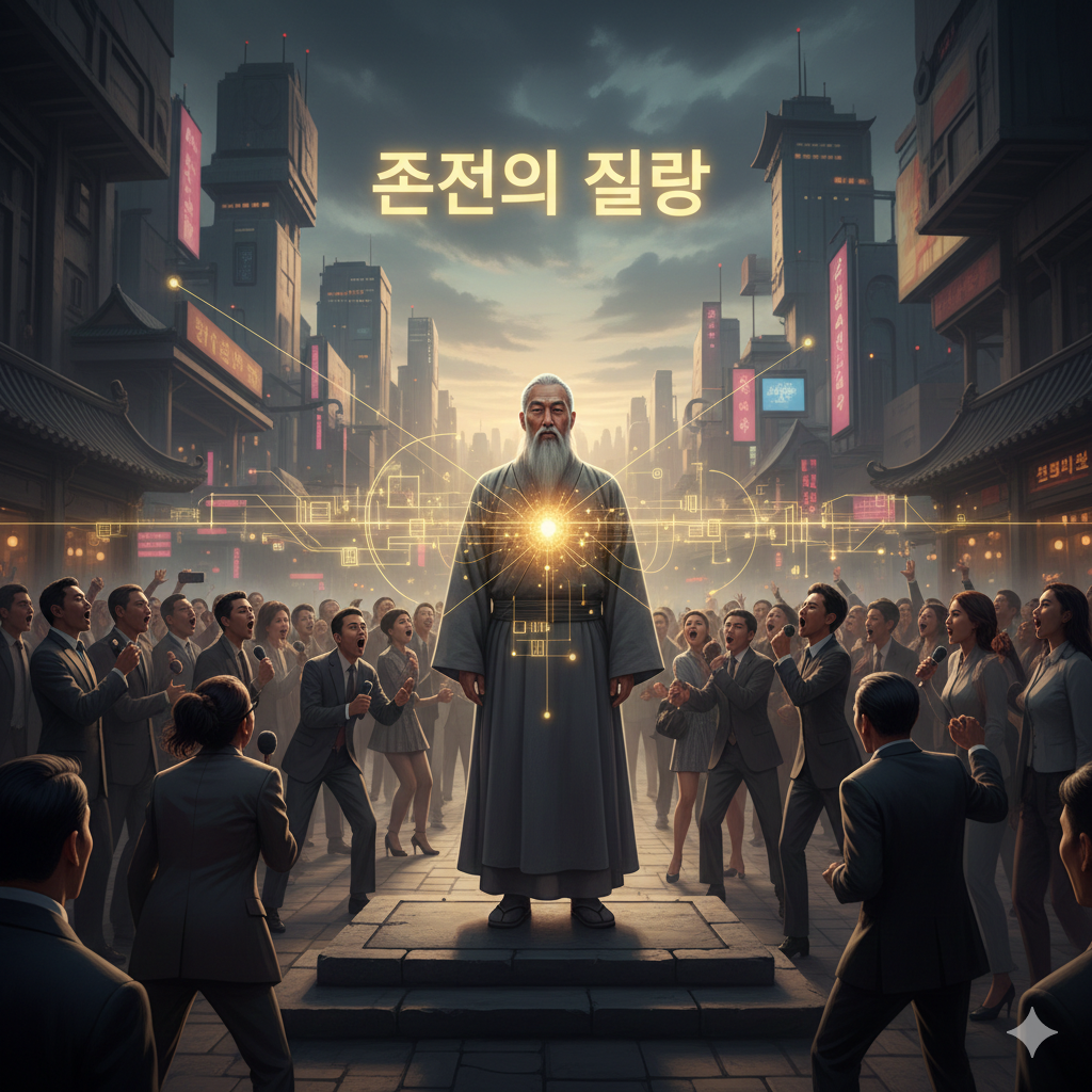 [이미지 프롬프트] An ancient, wise Asian philosopher with a long white beard, wearing a simple, dignified dark robe, stands on a small, raised platform in the middle of a bustling, futuristic city square. Around him, a crowd of modern businesspeople in suits are excitedly talking, gesturing, and seeking attention. The philosopher's chest glows with a powerful, golden, internal light, and intricate golden geometric patterns (representing knowledge and wisdom) emanate from him, connecting to the very architecture of the city, largely ignored by the attention-seeking crowd. The philosopher's expression is serene and knowing, contrasting with the chaotic energy around him. Above him, "존재의 질량" (Mass of Being) is written in Korean in a modern, elegant font.