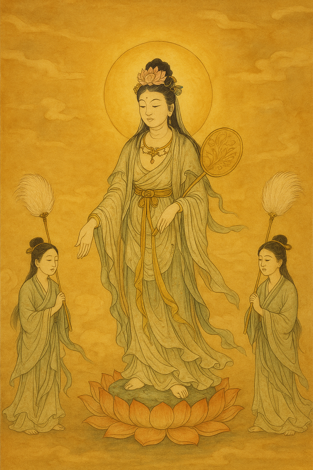 그리고 마리시텐께 빌 때는 천녀의 형상으로 된 상(像)을 만들되, 길이는 오 푼(약 1.5cm) 이상 두 치(약 6cm) 이하로 해야 합니다. 상은 서 있는 모습(입상)이나 앉아 있는 모습(좌상)으로 연꽃 위에 모시고, 머리는 아름다운 꽃으로 장식해야 합니다.