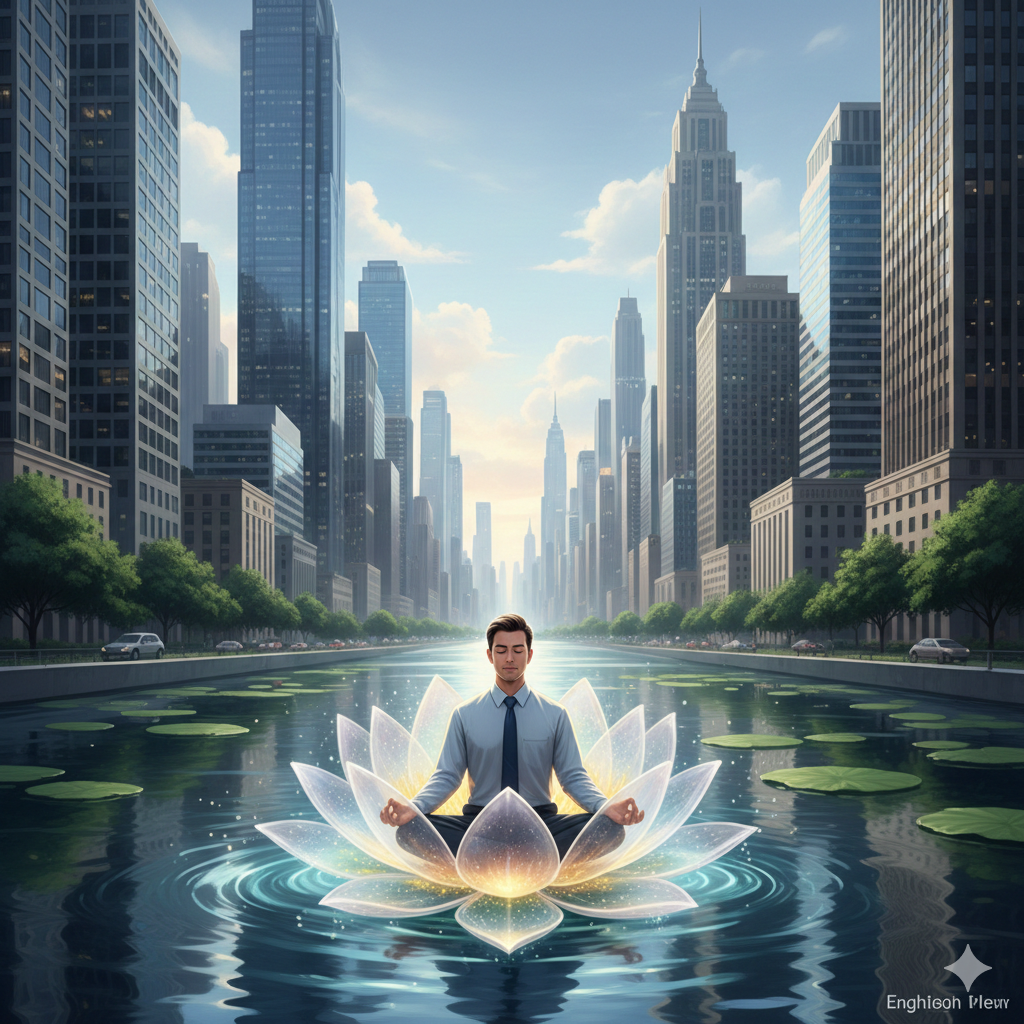 English: A serene person in business casual attire meditates within a transparent lotus flower floating on a glowing river, which symbolizes money and energy, flowing through a modern city with a skyline of skyscrapers. The composition harmoniously blends Eastern philosophy with a Western contemporary cityscape in a digital painting style.