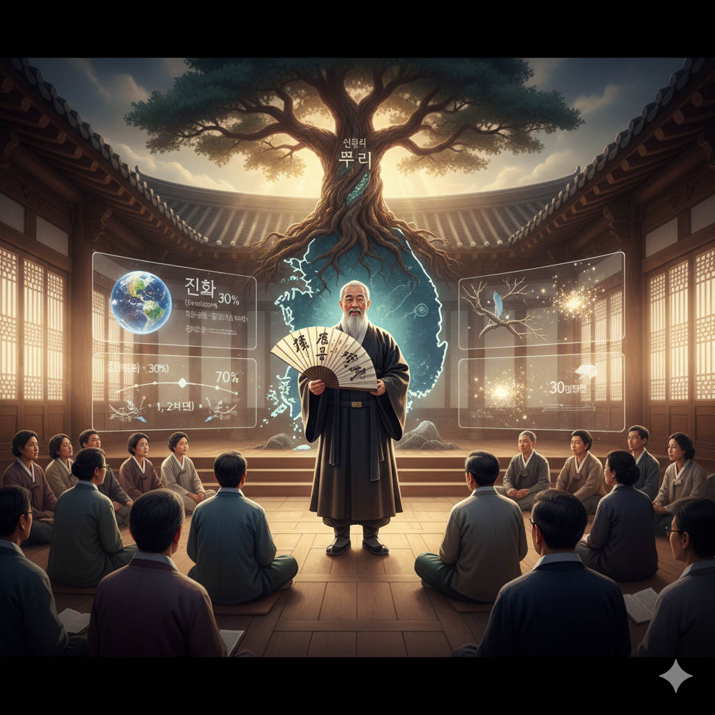 - 한글: 울창한 고목나무 아래에서 한복을 입은 선비가 부채를 펼치고 제자들에게 진리를 설파하는 모습입니다. 나뭇가지 사이로 따스한 햇살이 내리쬐며, 뿌리 부분은 한반도 지형을 닮아 강인한 생명력을 뿜어냅니다. 제자들은 각자 현대적인 태블릿과 고서적을 함께 들고 있어 전통과 현대의 조화를 보여줍니다. "바른 삶이 지구를 구한다"는 메시지가 은은한 빛의 입자로 허공에 산란됩니다.