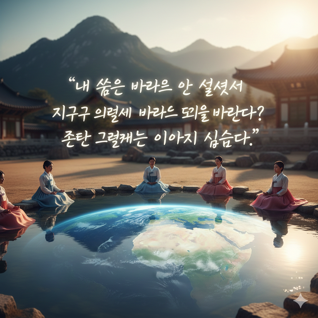 - 영어: A serene image of a blue Earth reflected in a calm pond, surrounded by the silhouettes of people meditating. The Korean calligraphy phrase "If I don't live my life rightly, can I expect the Earth to be right? Absolutely not." is subtly inscribed on the water. The overall atmosphere is peaceful and contemplative, with subjects wearing traditional Korean clothing.